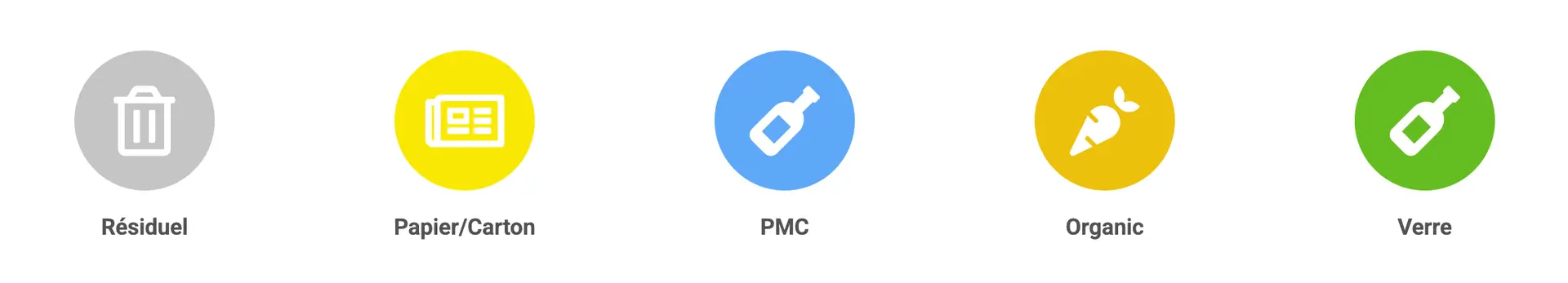 - Déchets recyclables comme le papier/carton, les métaux, le bois, le P.M.C,…