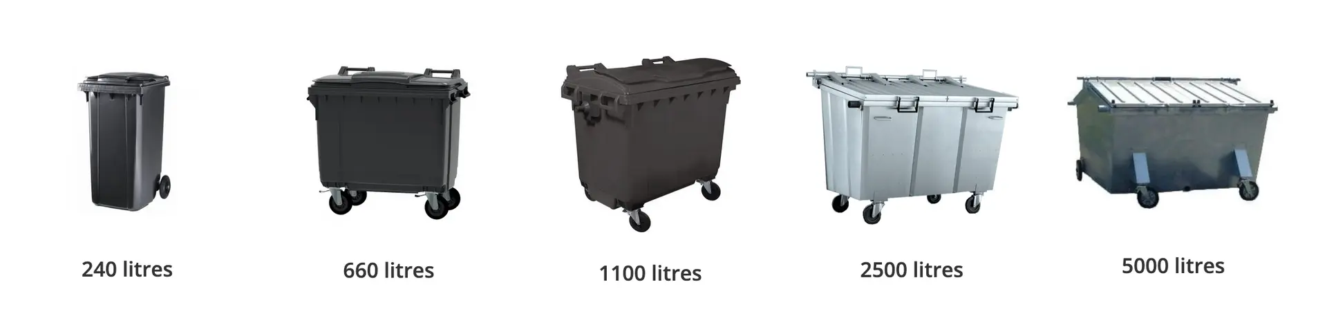 - Conteneur à roulettes 1.100 litres : Notre conteneur standard peut contenir l’équivalent de 18 sacs poubelles classiques.